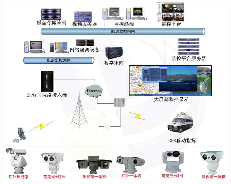 航道監(jiān)控作為數(shù)字航道中的一個組成部分,擔(dān)負(fù)著全天候?qū)崟r監(jiān)控航道上航標(biāo)運(yùn)行狀態(tài)、過往船只航行狀況、航道設(shè)施安全防范的職責(zé)。采用微波/光纖通信技術(shù)、數(shù)字視頻處理技術(shù)、IP通信技術(shù)和光纖通信技術(shù)等先進(jìn)的通信技術(shù)的網(wǎng)絡(luò)圖像監(jiān)控系統(tǒng)。是對數(shù)字航道的補(bǔ)充,可以在各種氣候及光線條件下24小時實(shí)時記錄航道現(xiàn)場情況,及時發(fā)現(xiàn)航標(biāo)狀況、船舶航行狀況、非法采砂和占用航道等現(xiàn)象,為航道暢通和大橋安全提供良好的保障。